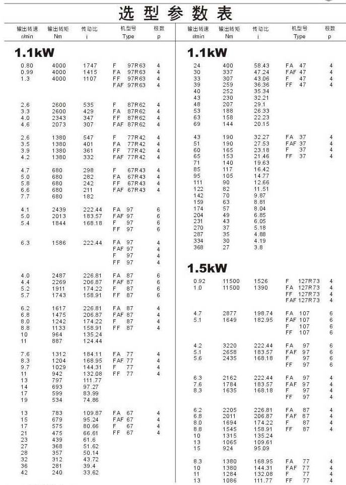 選型參數表1.1kW(續),1.5kW