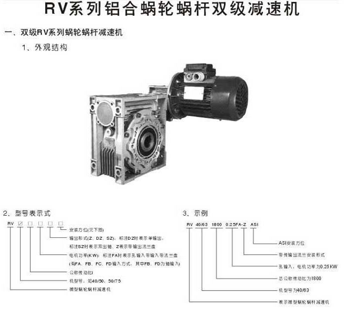 RV系列鋁合金蝸輪蝸桿雙級減速機雙級RV系列鋁合金蝸輪蝸桿減速機外觀結構型號表示法