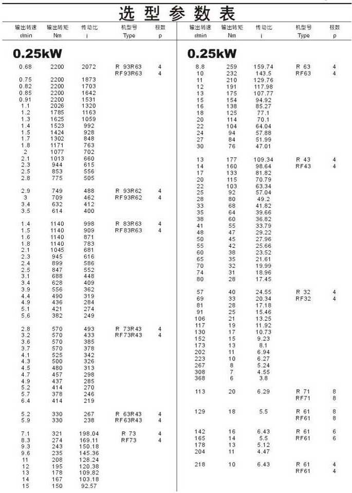 選型參數表0.25kW(續)